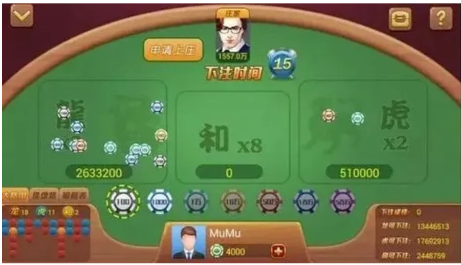 在所有下注选项中,“龙”和“虎”的出现概率相对较高,通常赔率为 1:1;而“和”的赔率虽高(一般可达 1:8),但出现概率较低。